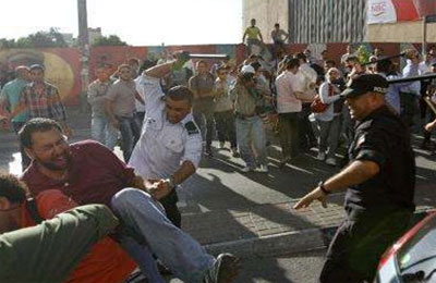 بث ناشطون على "يوتيوب" مقاطع وصورًا للتعامل العنيف مع المتظاهرين ضد قرار رئيس السلطة الفلسطينية وحركة فتح محمود عباس لقاء نائب رئيس الوزراء الصهيوني شاءول موفاز في مبنى المقاطعة في رام الله.