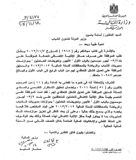 ووافق وزير المالية على الطلب وأرسل خطابًا إلى "ياسين" لإتمام الموافقة على صرف 200% حافز للعاملين المتعاقدين اعتبار من 1 أكتوبر.