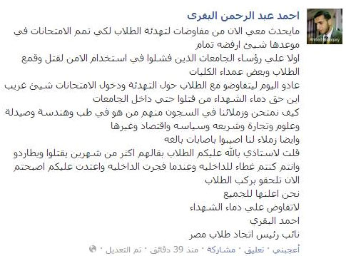 وقال البقري في تدوينة له على موقع التواصل الاجتماعي "فيس بوك": "ما يحدث معي الآن من مفاوضات لتهدئة الطلاب لكي تتم الامتحانات في موعدها شيء أرفضه تمامًا"؛ مؤكدًا أن دماء الشهداء غير قابلة للتفاوض.