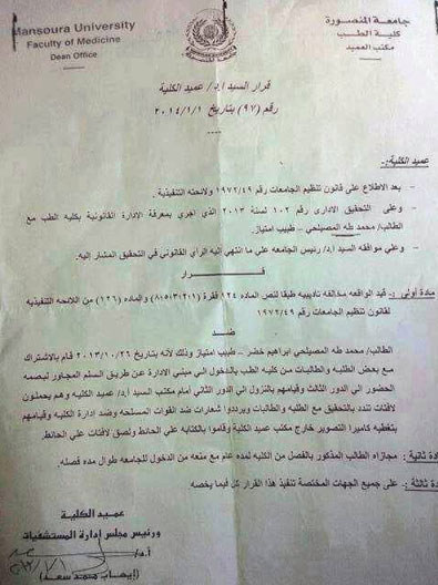 قررت إدارة الانقلاب الدموي جامعة المنصورة فصل الطالب محمد طه المصيلحي الطالب بامتياز كلية الطب لمدة عام من الجامعة بتهمة اقتحام مبنى الإدارة.