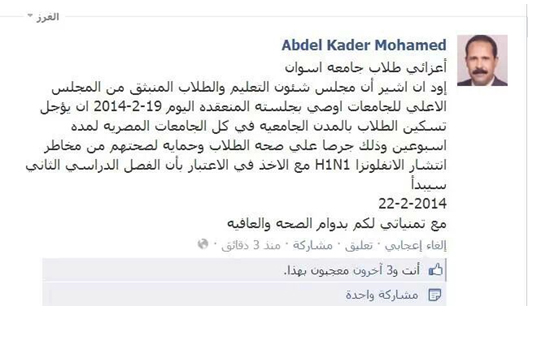 قال الدكتور عبد القادر محمد نائب، رئيس جامعة أسوان, أن مجلس شئون التعليم والطلاب المنبثق من المجلس اﻷعلى للجامعات أوصى بجلسته المنعقدة أمس أن يؤجل تسكين الطلاب بالمدن الجامعية في كل الجامعات المصرية، لمدة أسبوعين وذلك حرصًا على صحة الطلاب وحماية لصحتهم من مخاطر انتشار الإنفلونزا H1N1 المعروف بأسم إنفلونزا الخنزير, أو الإنفلونزا الموسمية.
