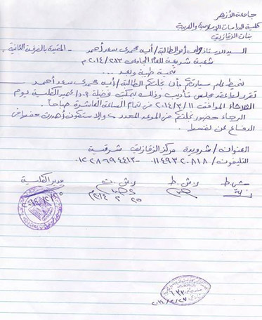 جديرٌ بالزكر أن محكمة القضاء الإداري بالشرقية كانت قد قضت بإلغاء قرار الفصل لمدة عام الصادر بحقِّ 11 طالبة من طالبات كلية الدراسات الإسلامية بجامعة الأزهر فرع الزقازيق، وما يترتب على ذلك من آثار.