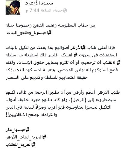 قال محمود الأزهري المتحدث الرسمي باسم طلاب الأزهر ضد الانقلاب: إذا أعلى طلاب الأزهر أصواتهم بما يحدث من تنكيل بالبنات المعتقلات في سجون العسكر فليس ذلك استجداءً من سلطة الانقلاب أن ترحمهم، أو أن تلتزم بمعايير حقوق الإنسان، ولكنه فضح لسلوكهم العدواني الوحشي، وتعرية لمسلكهم الذي يؤكد حقيقة اغتصابهم للسلطة وكذبهم على الشعب".