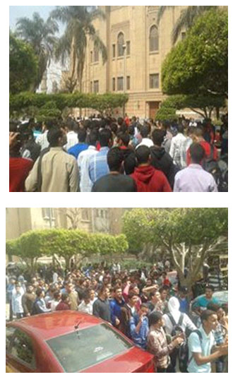 رفع الطلاب شارات رابعة العدوية، وﻻفتات تندد بتعامل مليشيات الانقلاب مع طﻻب الجامعات المصرية، وردد الطلاب هتافات ساخرة من إعطاء جائزه اﻷم المثالية للراقصة "فيفي عبدة" وأيضًا من مؤيدي السيسي منها "اﻷم المثالية فنانة استعراضية.. بتحب السيسي ليه جوز أمك وﻻ إيه".