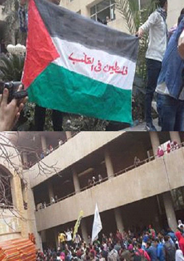 وبعد أن وصلت المظاهرة إلى كلية حقوق للمرة الثانية منذ بداية التيرم الثاني ارتفعت أعلام فلسطين وسوريا تضامنًا معهم، وأحرق الطلاب علم الكيان الصهيوني مع هتافات ضد العدو الصهيوني، رافضين تدخله، وأطلقوا بعض الشماريخ فرحة بحرق العلم الصهيوني.