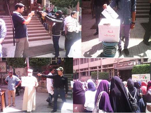 وارتدي الطلاب الطراطير تهكمًا وسخريةً من الطرطور عدلي منصور، وهتفوا "عدلي منصور هو الطرطور"، ورددوا أيضًا هتافات منها "يسقط يسقط حكم العسكر- فتش في شنط البنات.. مشي ورانا مخبرين.. لسه برضه مكملين- ياللي بتسأل احنا مين احنا الطلبة المفصولين".