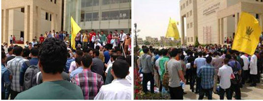 رغم القهر والظلم وحرب الإبادة نظم طلاب جامعة سيناء فاعليات مناهضة للانقلاب أمام كلية طب الأسنان، صباح اليوم اشتملت على وقفة احتجاجية ومسيرات داخل الحرم الجامعي ومشهد تمثيلي ساخر عن معاناة أهل سيناء من قطع شبكات الإتصال وانعدام المواصلات الداخلية والانتهاكات التي يتعرض لها الطلاب داخل الجامعة .