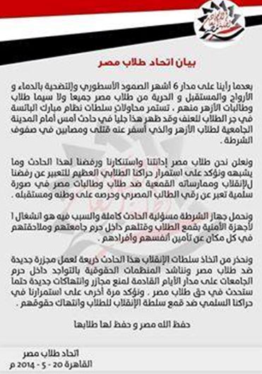 وأضاف في بيان اتحاد طلاب مصر: "بعدما رأينا على مدار 6 أشهر الصمود اﻷسطوري والتضحية بالدماء واﻷرواح والمستقبل والحرية من طلاب مصر جميعاً ولا سيما طلاب وطالبات اﻷزهر منهم، تستمر محاولات سلطات نظام مبارك البائسة في جر الطلاب للعنف وقد ظهر هذا جلياً في حادث أمس أمام المدينة الجامعية لطلاب اﻷزهر والذي أسفر عنه قتلى ومصابين في صفوف الشرطة ".