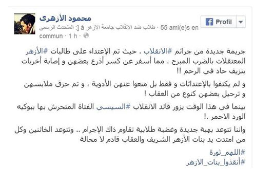 وأوضح أننا نتوعد بهبة جديدة وغضبة طلابية تقاوم ذاك الإجرام وتتوعد الخائنين وكل من امتدت يد بنات الأزهر الشريف والعقاب قادم لا محالة.