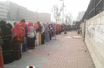 تقف الطالبات فى طوابير تمتد مئات الأمتار على الرصيف لانتظار دورهن في التفتيش حتى يتمكن من دخول الجامعه .