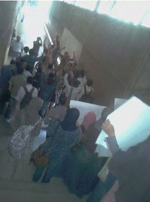 ورفع الطلاب صور لزملائهم ولشهداء الجامعة مرددين هتافات ضد إدارة الجامعة المتواطئة مع الامن ضد الطلبة .