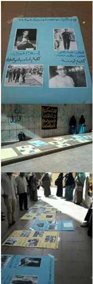أقام طلاب كلية الخدمة الاجتماعية بجامعة حلوان اليوم معرضًا في ساحة الكلية عبروا فيه عن شعورهم تجاه زملائهم الشهداء والمعتقلين واستيائهم للوضع الحالي للجامعة.