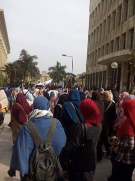 ردد الطلاب هتافات ضد رئيس الجامعة جابر نصار ضد تأمين الجامعة من جانب شركة فالكون، مطالبين بفك الحصار عن الجامعة أو الفوضى.