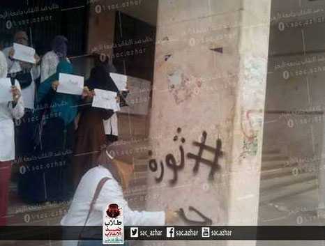 نظمت طالبات كلية الصيدلة للبنات جامعة الأزهر فرع القاهرة وقفة على سلالم الكلية للتنديد بالاجراءات القمعيه لإدارة الجامعة باستدعاء ميلشيات الانقلاب بدون داع إلى حرم الجامعة يوميًّا.