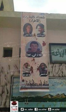 علق طلاب كلية الزراعة بجامعة الأزهر، بنرات ولافتات تحمل صور شهداء الجامعة، علي جدران الكلية، منددين بإقتحام بلطجية الداخلية للحرم الجامعي وإعتقال رافضي حكم العسكر.
