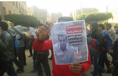 رفع الطلاب شارات رابعة العدوية، وصور " شريف الفقي" شهيد كلية اﻹعلام، كما رفعوا ﻻفتات مدون عليها " فالكون برة.. الجامعة حرة .. ثورو حرم .. ثورة حتي النصر ".