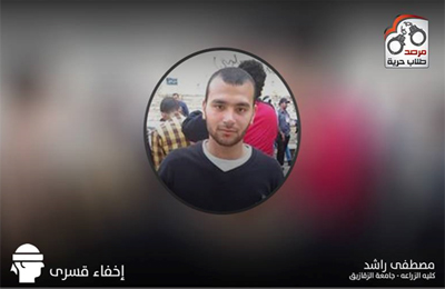 وأوضح المرصد عبر موقعة أن  قوات أمن الانقلاب اعتقلت الطالب  "مصطفى راشد" الطالب بالفرقة الرابعة بكلية الزراعة قسم الميكروبيولوجي جامعة الزقازيق تعسفيًّا مخالفًا للقانون يوم الخميس الماضي الموافق 5 من مارس الجاري وقامت  بإخفائه قسريًا, حتى هذه اللحظة, ولم يتم الإفصاح عن مكانه لأي من محاميه أو أهله.